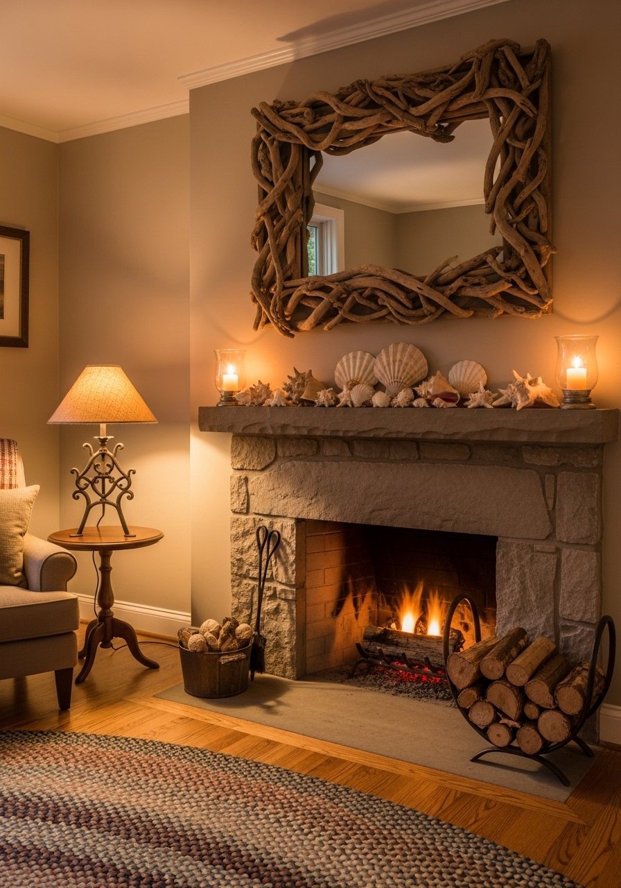 Driftwood Mirror Above a Fireplace Mantel for Coastal Character