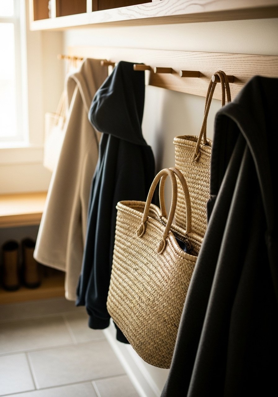 A wooden peg rail solved my coat clutter and looks styled. It works in entries, mudrooms, and bathrooms. Pick pegs set 6 to 8 inches apart to hang jackets comfortably. Photos show neat hooks. In real life chunky coats need solid anchors. Avoid flimsy wall screws that will pull out. I installed a solid wood peg rail with proper anchors.