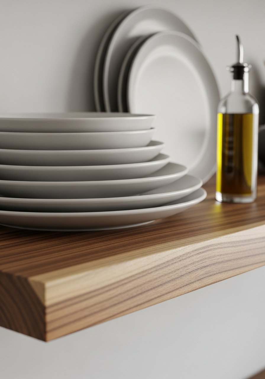 I swapped a painted shelf for a live-edge floating shelf and everyday dishes looked styled. For kitchens choose a sealed finish and 12 inch depth for plates. Photos highlight the grain. In use you want shelves that can handle weight, so check hardware load rating. Avoid wood that reacts to humidity. Try live-edge kitchen shelves.