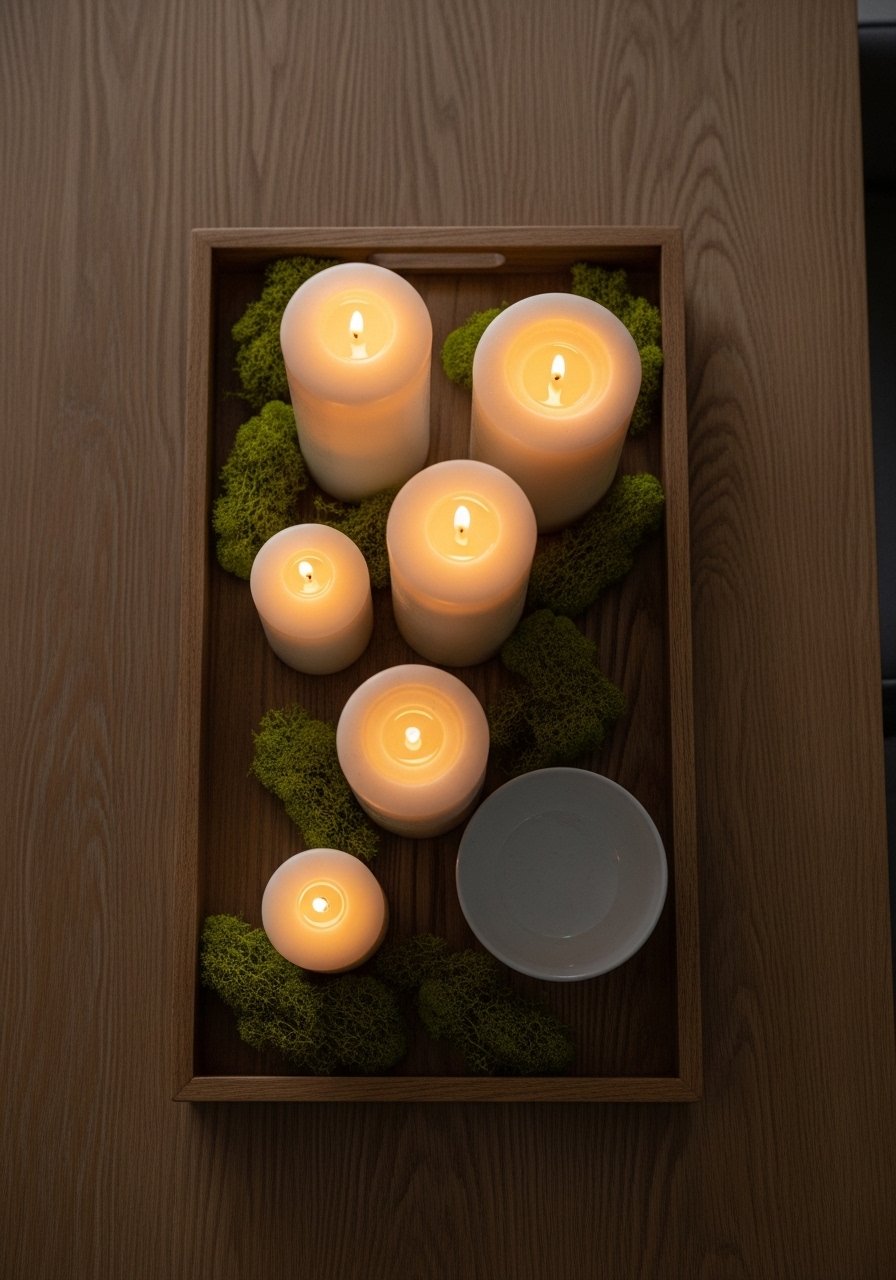 I found a simple wooden tray and table styling became easier. Use an odd-number grouping and mix heights for candle arrangements. For a 6-seat table pick a tray 18 to 24 inches long. Photos tend to show perfect flame sizes. In daily life use flameless candles for safety. Avoid overloading with breakable items in the center of the table. Try natural wood trays.