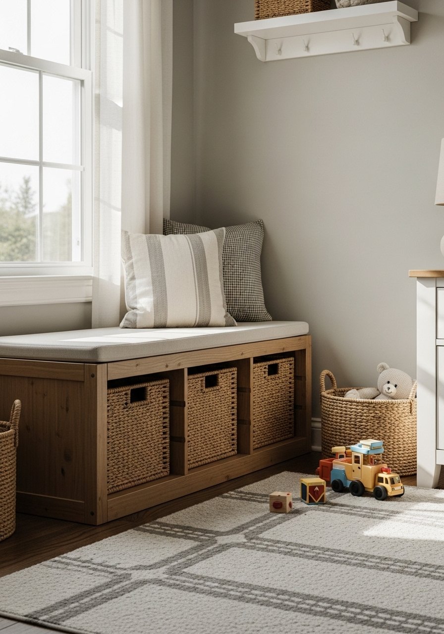 I wanted toy storage that did not read childish. Low wooden benches with baskets do the trick. For families pick units at child height so cleanup is easy. Photos of toy storage often hide chaos. In real life choose durable finishes that resist scuffs. Avoid plastic bins that show mess. Try wooden toy storage benches paired with woven baskets.