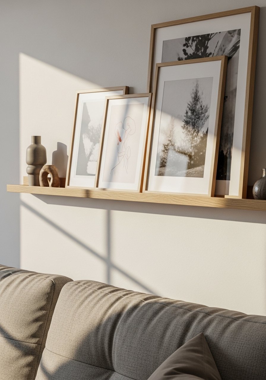 I swapped nails for picture ledges and update art seasonally now. Thin oak ledges allow easy rotating without patching walls. For living rooms mount them 6 to 8 inches above the sofa back. In photos ledges look effortlessly layered. In reality secure them to studs for heavy frames. Avoid shallow ledges that tip. Consider oak picture ledges set.
